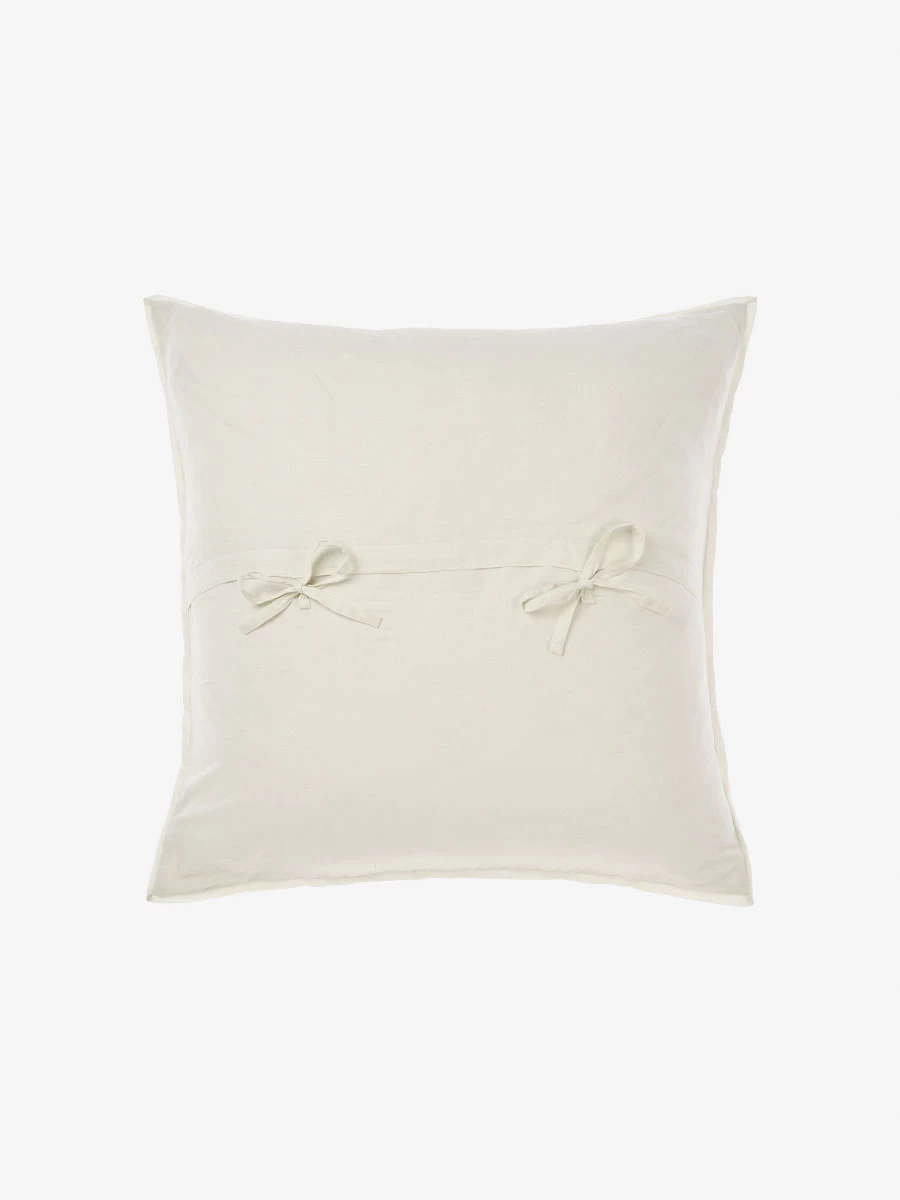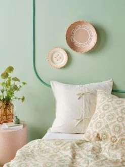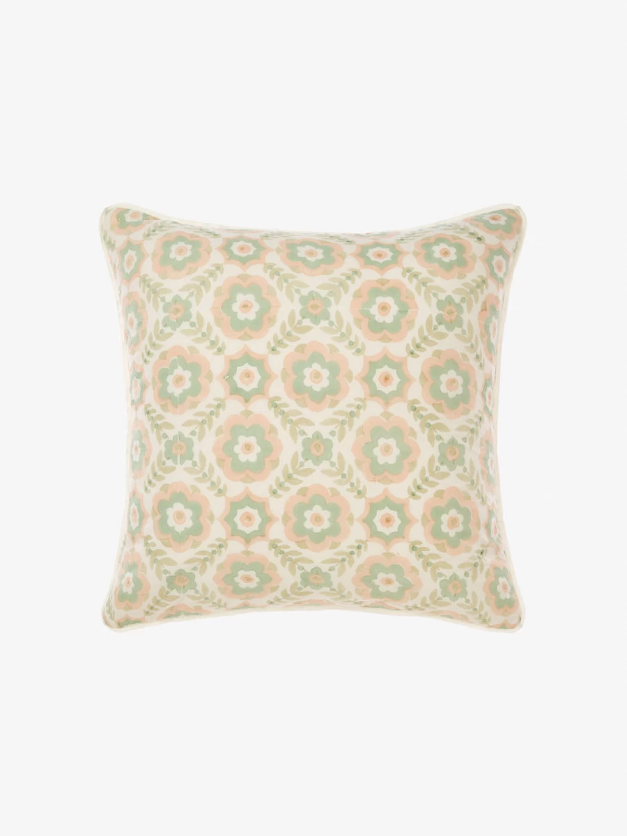 Based on a vintage seventies wallpaper look, this soft green and pastel-hued European pillowcase enjoys a 120 GSM polyester fill, has stylish ties on its reverse, is trimmed with a bound edge, and looks sensational paired with its matching bed cover, pillow sham pair, and cushion for impact.