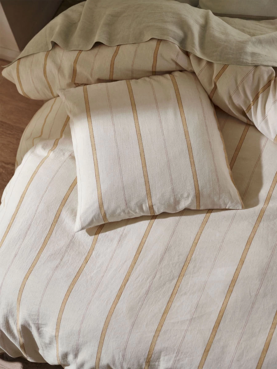 A timeless stripe to last beyond the seasons, Cae is a fully reversible, woven cotton linen that enjoys a yarn-dyed stripe with a chic herringbone detail.