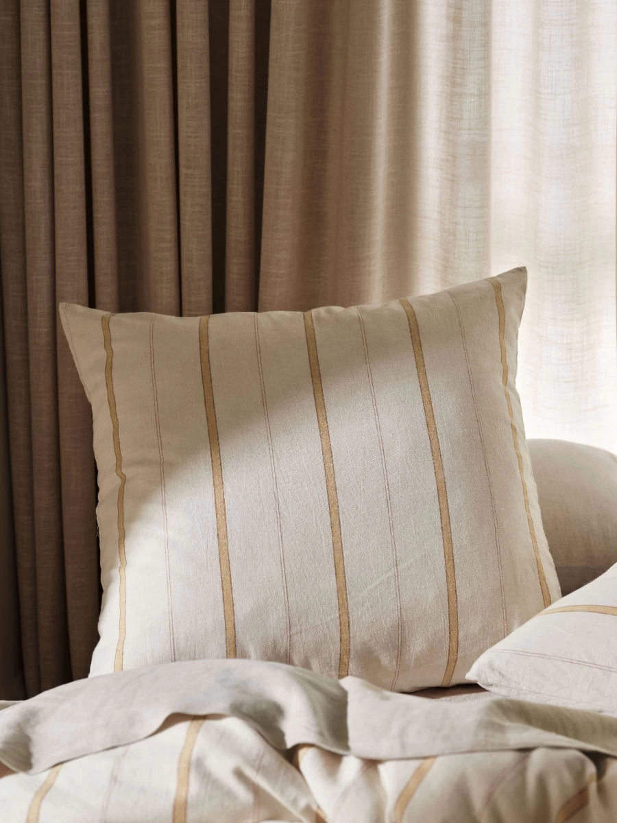 A timeless stripe to last beyond the seasons, Cae is a fully reversible, woven cotton linen that enjoys a yarn-dyed stripe with a chic herringbone detail.