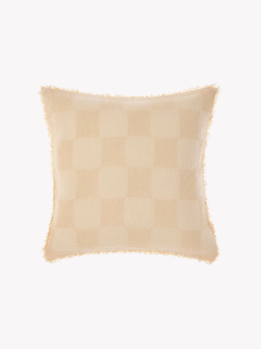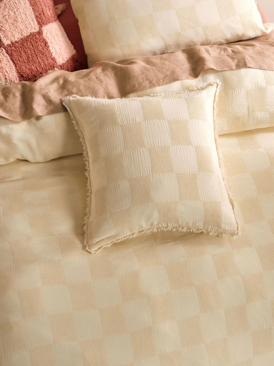 A sweet yet subtle checkerboard aesthetic in alluring pale peach, this cushion offers varying scales of woven waffle in the softest cotton voile.