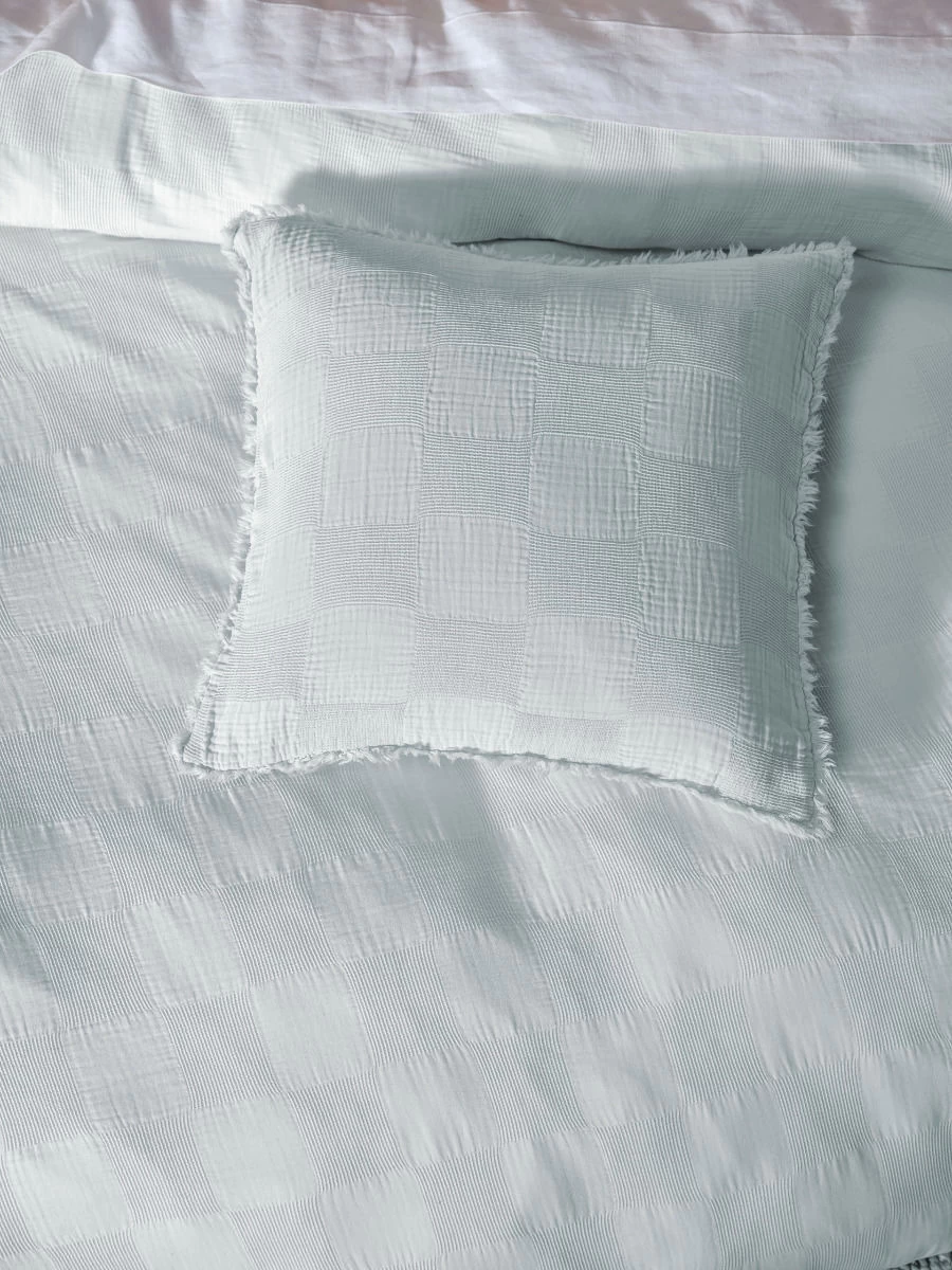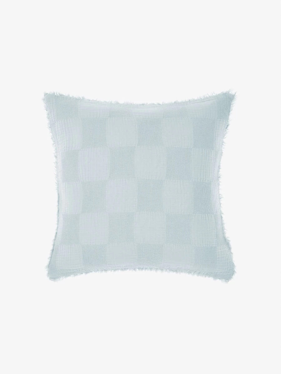 A sweet yet subtle checkerboard aesthetic in tranquil sky, this cushion offers varying scales of woven waffle in the softest cotton voile.