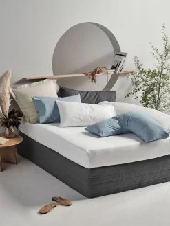 The fitted sheet has a generous 50cm wall while the flat sheet and pillowcases are cuffed and piped. Luxuriate in the full Haven experience with its matching bed linen in matching or varied hues.