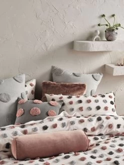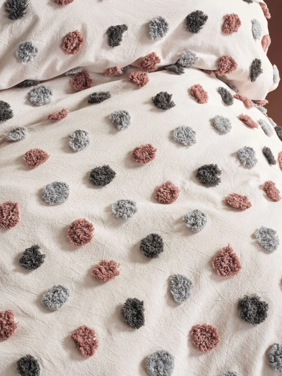 Perfectly everlasting, this set with fluffy, multi-coloured spots of dusk, grey and slate is a bedroom essential.