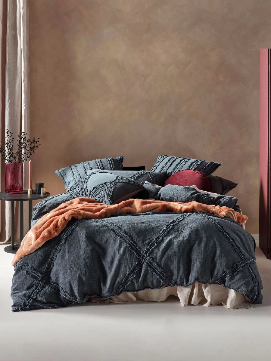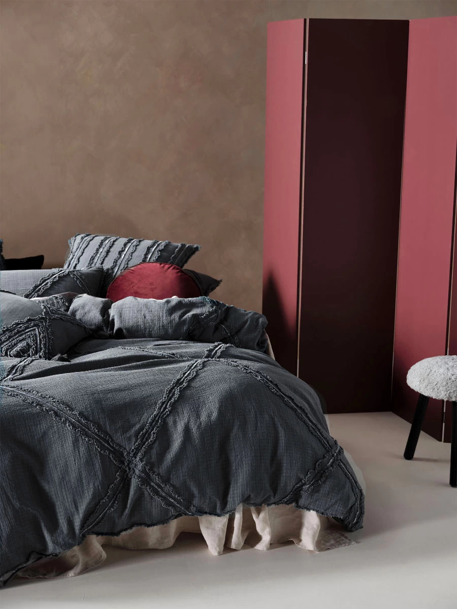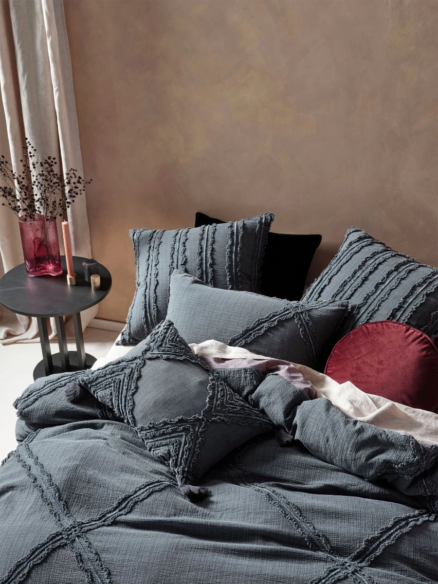 Pair this Bohemian set in slate with its coordinating European pillowcases and tasseled cushion to see you through the cooler months, as well as textured plains and intriguing prints to welcome in spring.