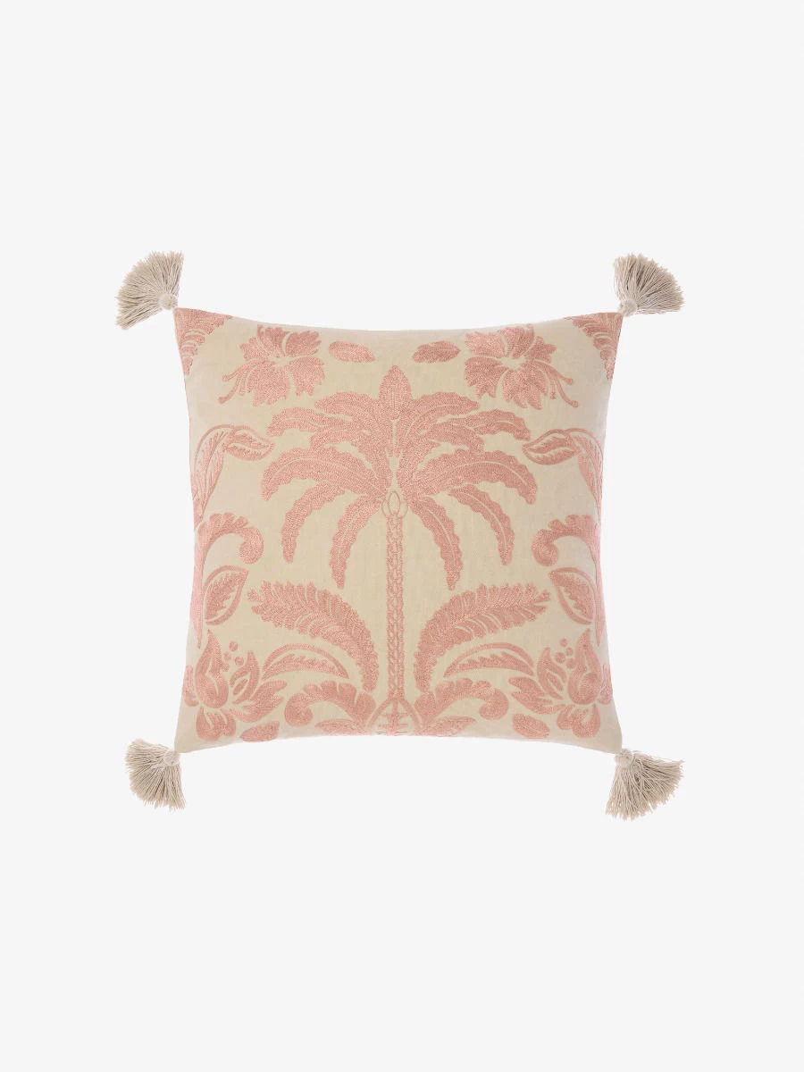 With its chain-stitched embroidery on a cotton ground, this corner-tasselled cushion combines Art Deco-inspired motifs with classic, scarf-like patterns.