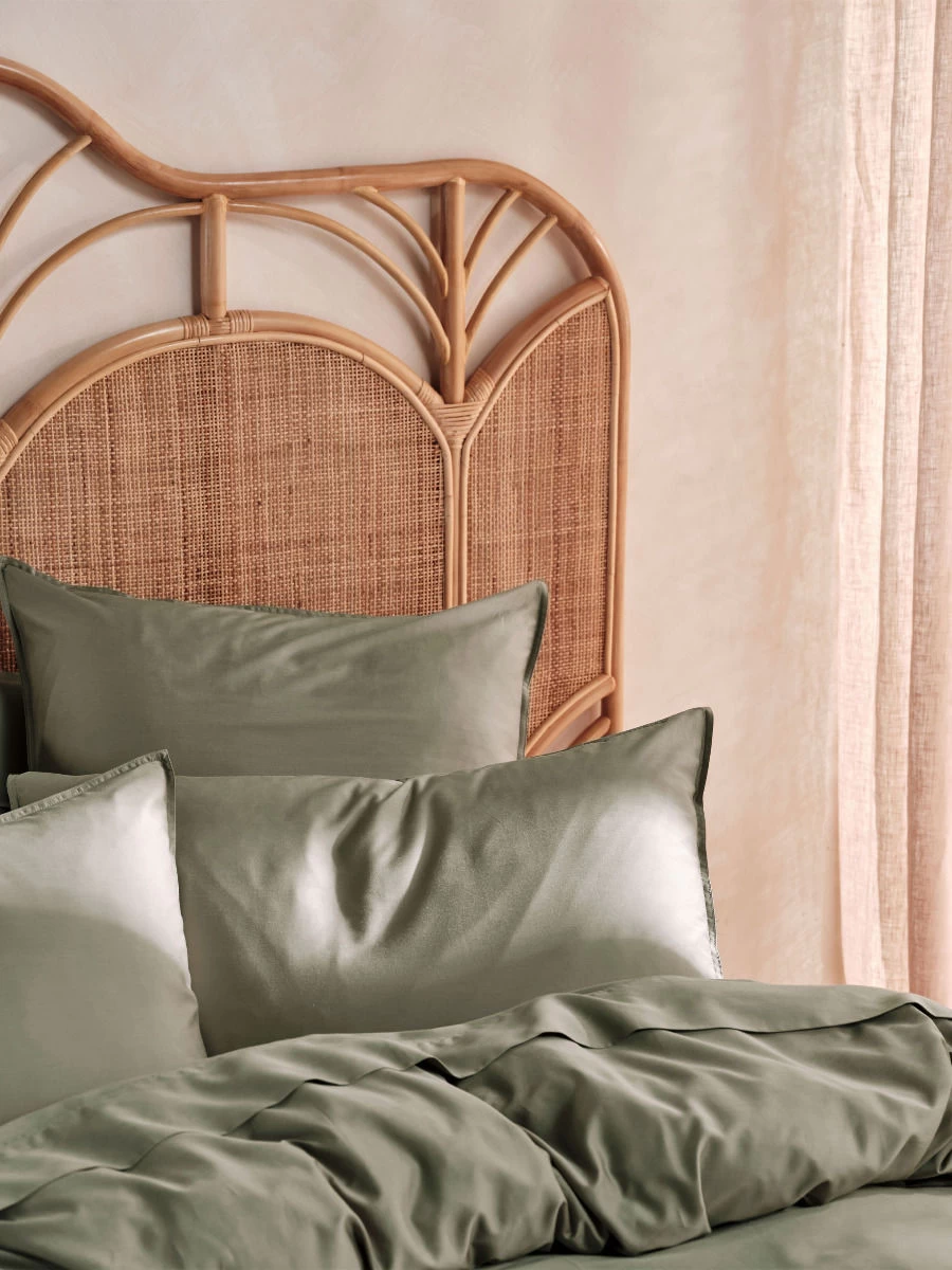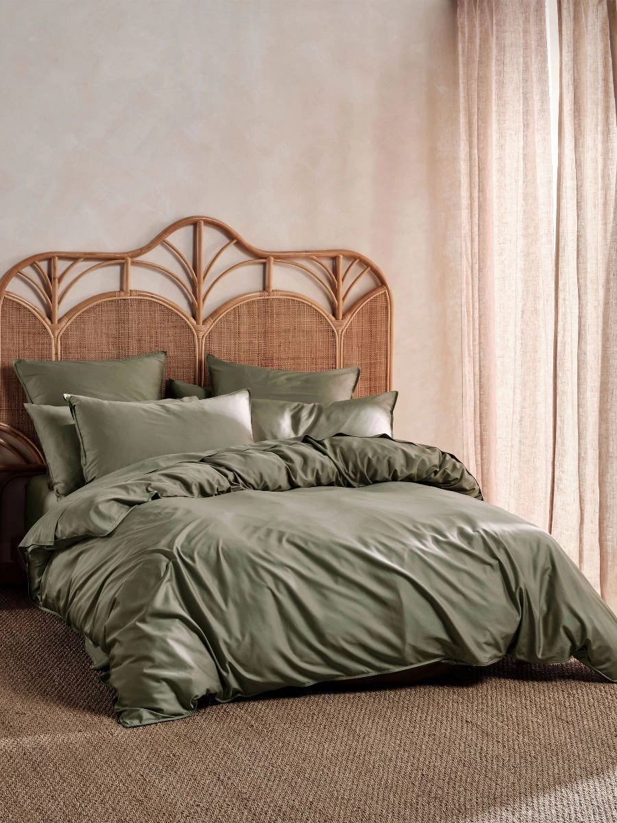 Smoother than silk and made from high-quality, 400 thread bamboo/cotton, this Nara quilt cover set in moss enjoys a luxe sateen weave and is trimmed with stitched borders.