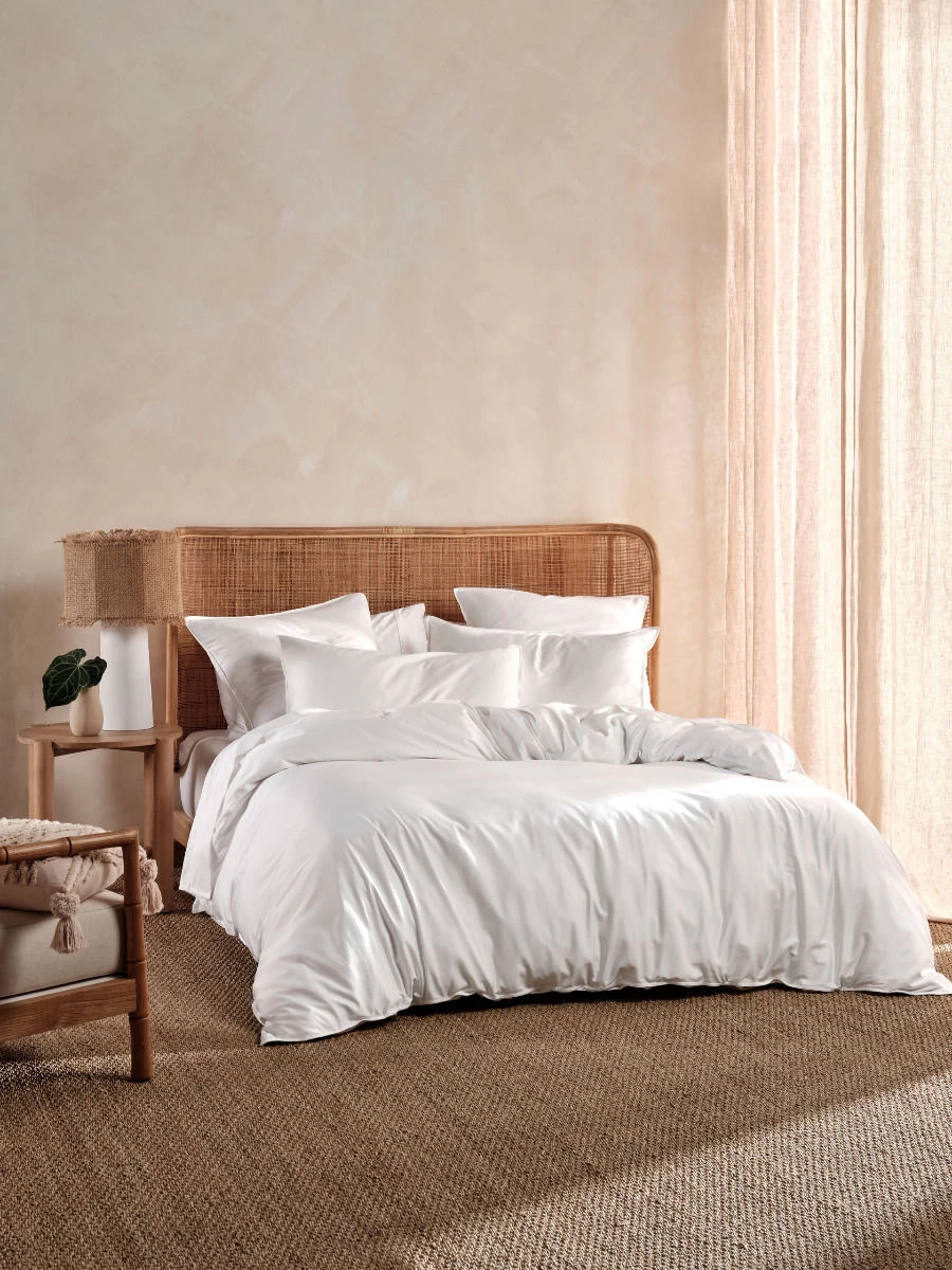 Smoother than silk and made from high-quality, 400 thread bamboo/cotton, this Nara quilt cover set in white enjoys a luxe sateen weave and is trimmed with stitched borders.