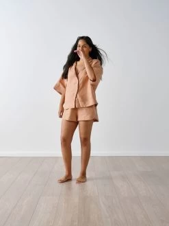 With a new, oversized fit from our previous shirt style, this short-sleeved and cropped shirt includes a collar and buttons, while the fabric will soften more so over time – perfect for everyday wear, sleepwear or an all-day lounge-around.