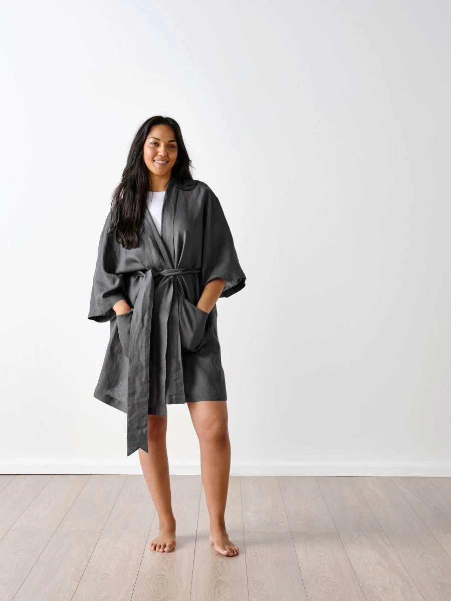 The epitome of effortless, our kimono-style Nimes short robe in magnet enjoys that lived-in style and breathable feel that can only be achieved with pure linen.