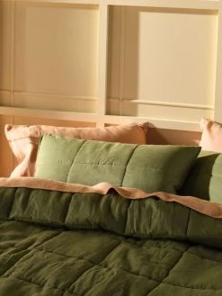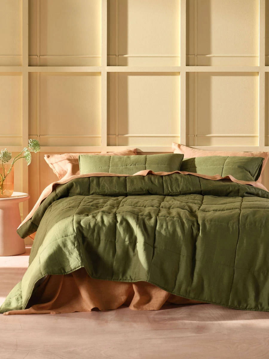 With a 120 GSM polyester fill for added comfort, this coverlet in moss enjoys linen all over, allowing its beautifully natural fabric to speak for itself.