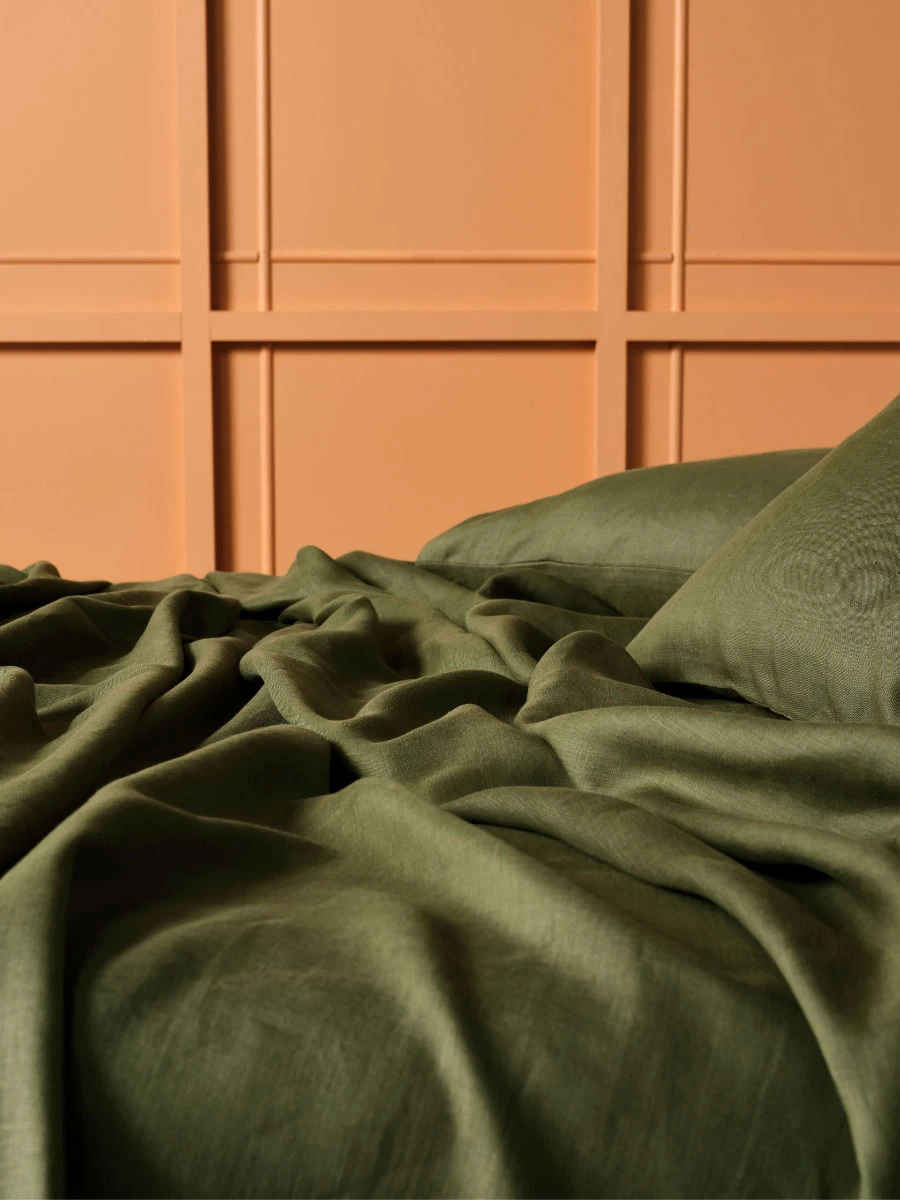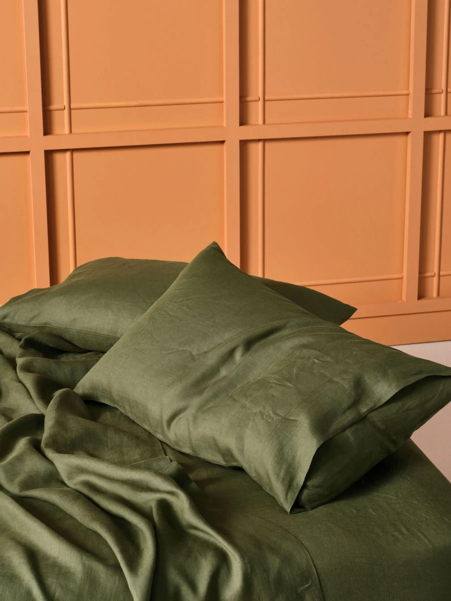 The timeless appeal of linen brings a rustic aesthetic to modern living. With its vintage look and drape, our Nimes sheet set in moss is suitable all-year-round.