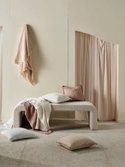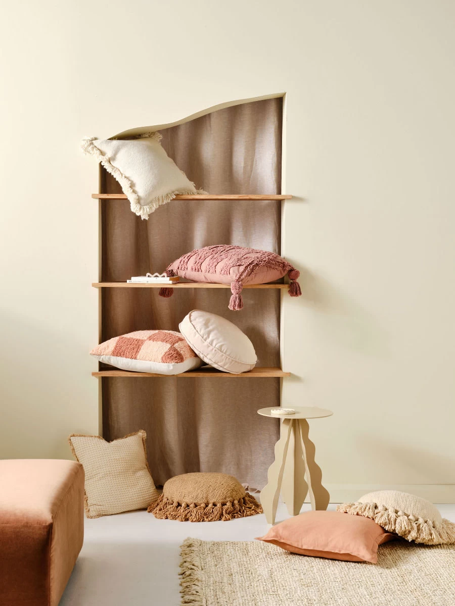 This pale peach cushion is trimmed with cotton fringing for rustic appeal and exudes an easy-living vibe that will work in your bedroom or living area.