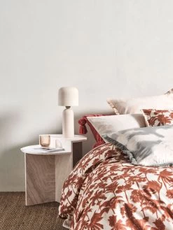 This set, which is printed on a crisp cotton percale and trimmed with fringing, looks outstanding paired with its larger-scale printed European pillowcases and matching cushions, all with matching trims.
