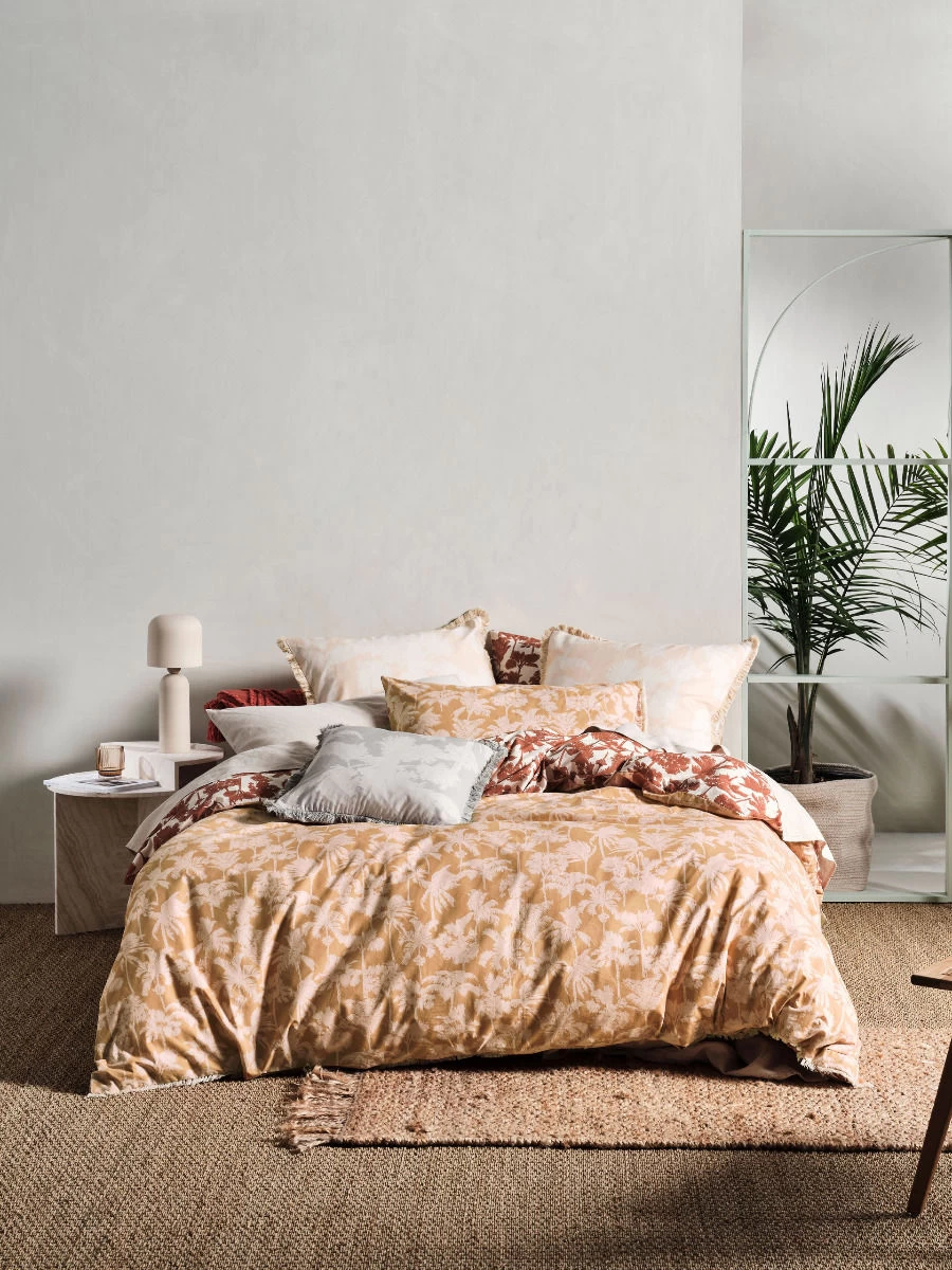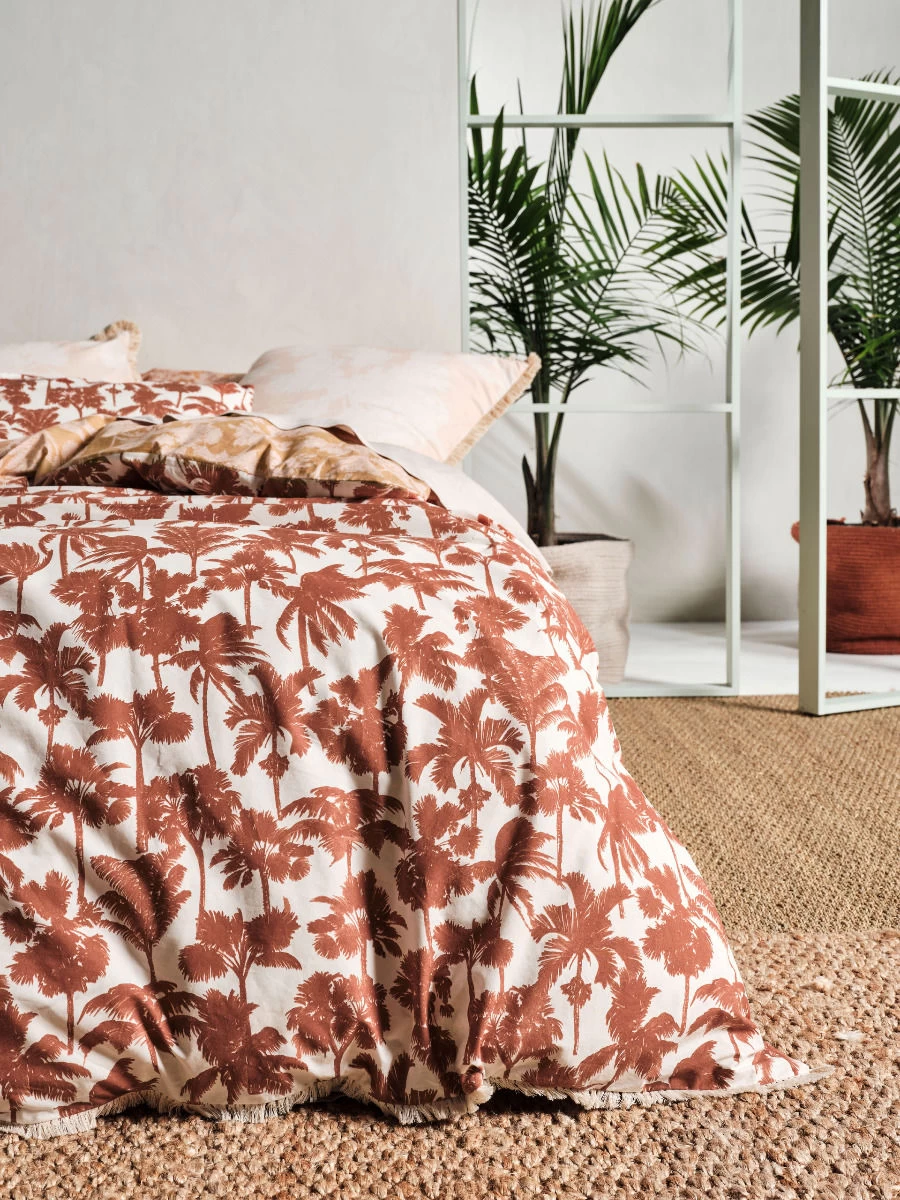 A sweet, stylish micro palm scene, the beauty of Tourelles is its reversible design from a paprika to a chai-blush ground – perfect to accommodate your mood and style.