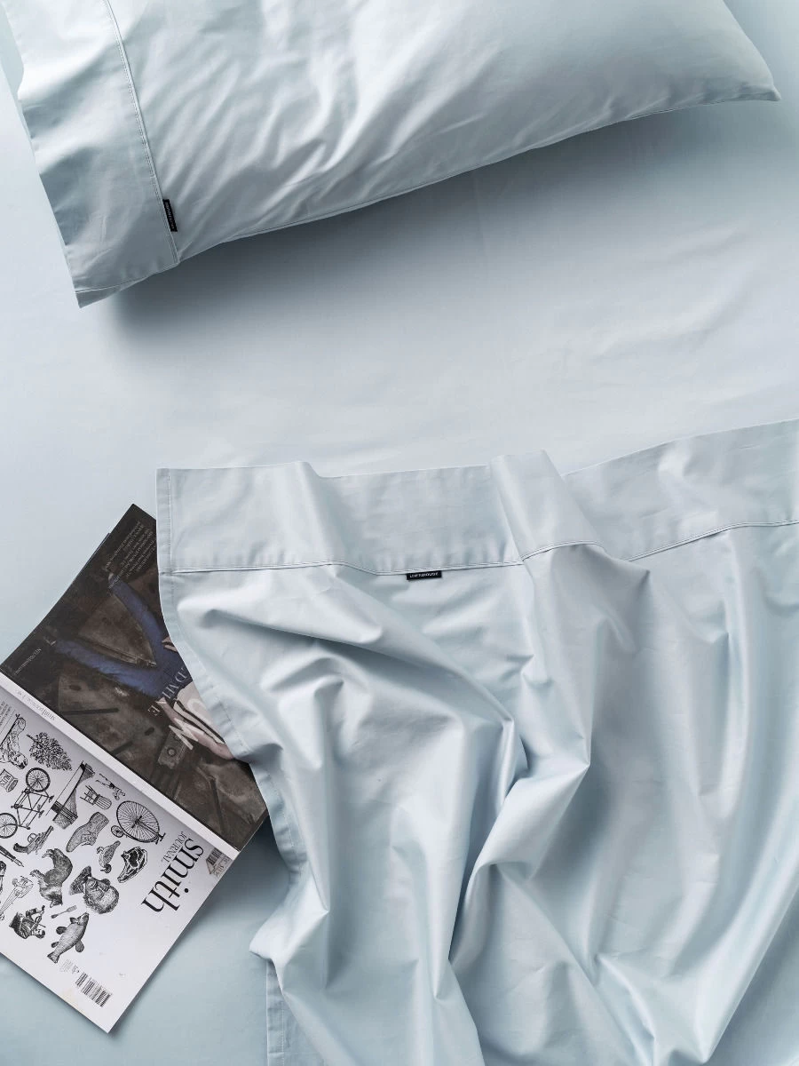 The flat sheets and pillowcases are cuffed and piped while the fitted sheet has a 40cm wall.